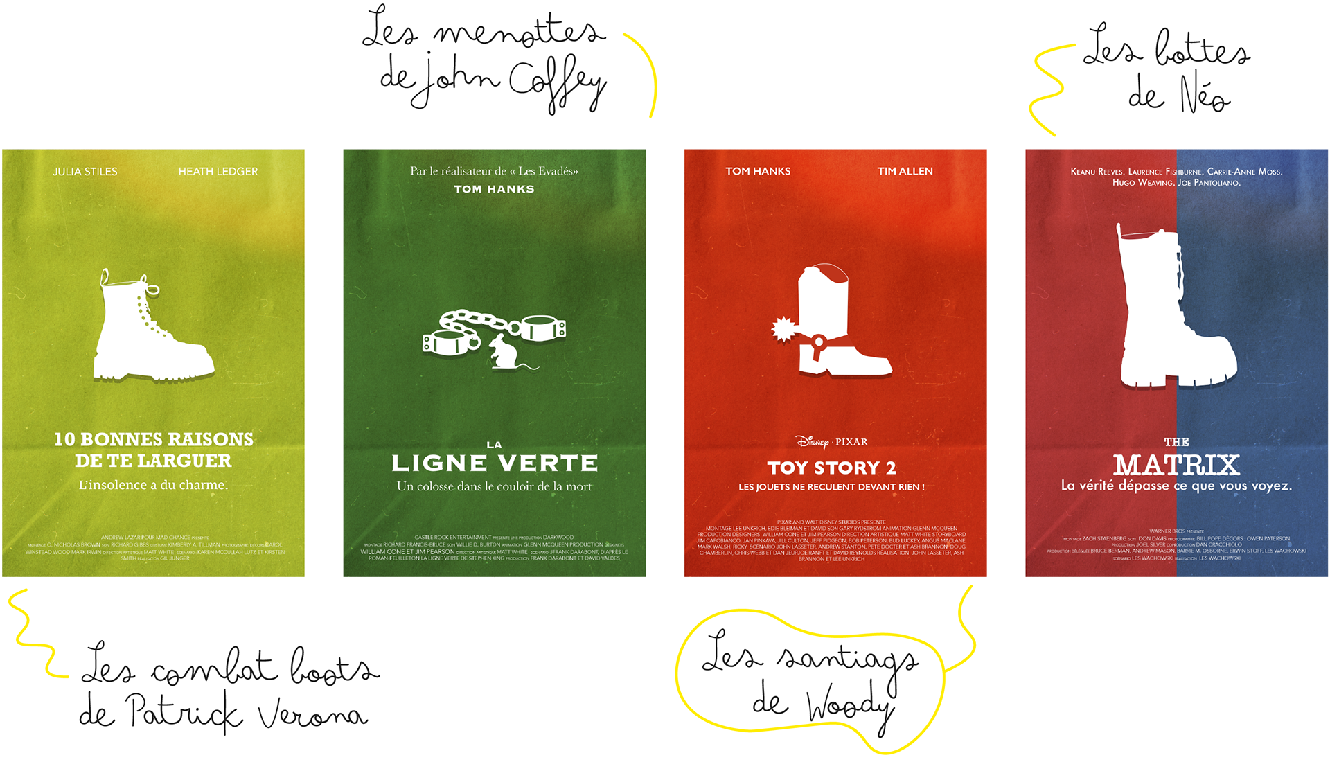 J’ai réalisé une série d’affiches autour de quatre films cultes sortis en 1999,en mettant en avant un détail souvent oublié: les chaussures.